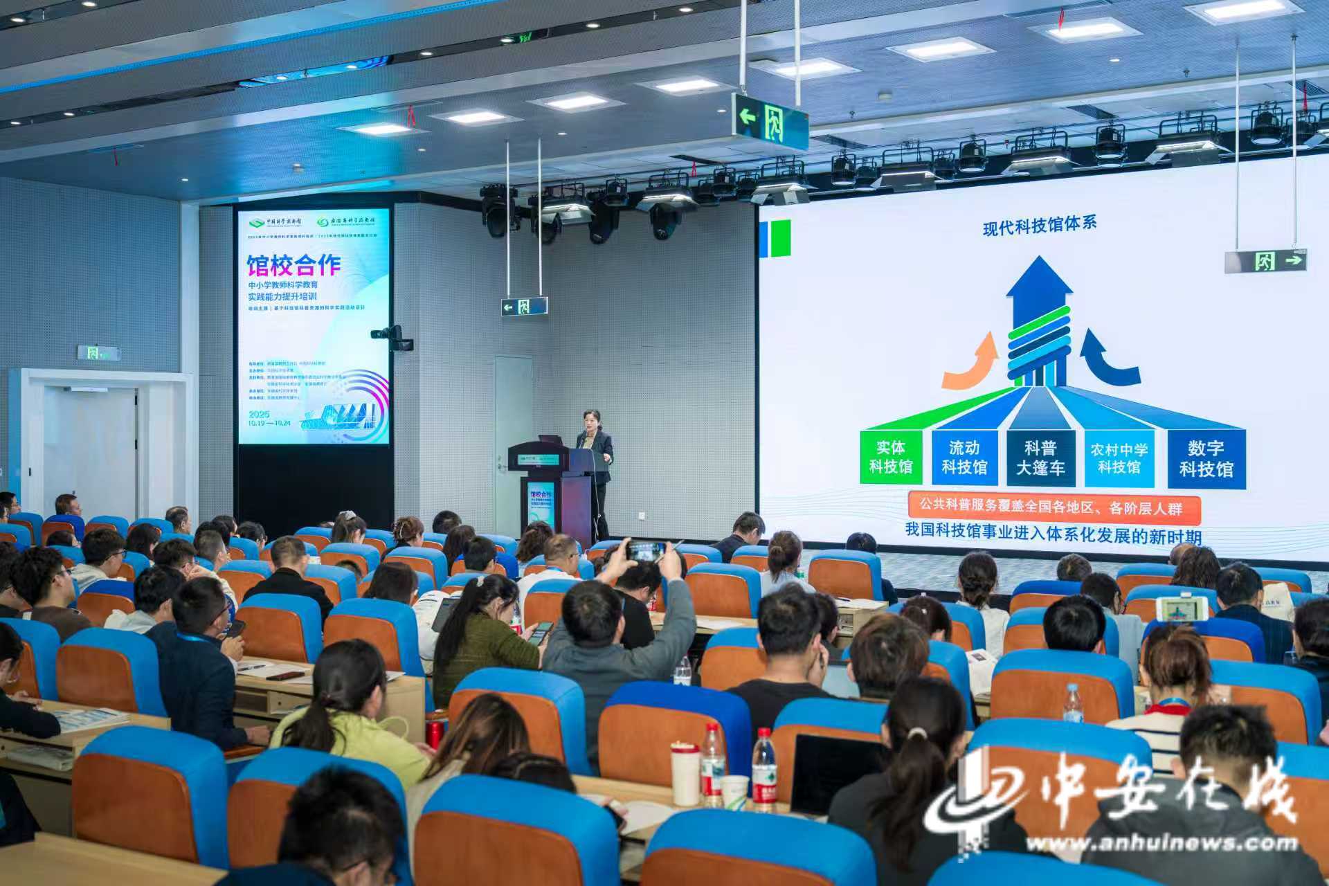 众安在线、众安新闻客户端消息10月20日,2025年馆校合作中小学教师科学实践能力提升计划(第七期)在安徽省科技馆举行。来自上海、江苏、浙江、安徽等省市的中小学科学教师和科学传播顾问代表共120人参加了培训。本次培训为期五天,以“基于科技馆科普资源的实践科学活动设计”为主题,通过专题讲座、案例分析、课程设计、经验交流等方式,围绕科学教育教学中的实验需求。结合科技馆展品和科普资源,指导教师进行实验设计和科学技能,提高教学创新和学科交叉。旨在进一步发挥科技在科普教育体系建设中的独特作用,共同构建“馆校融合、资源共享、人才培养”的科普教育新生态。当天,中国科技馆党委书记、副馆长钱岩作题为《建设科技馆推动科普教育高质量发展》的主旨演讲。他全面系统地阐述了科学教育发展的理念和过程,分享了科技博物馆在科学教育实践中探索的经验,阐述了科技博物馆在科学教育发展中的关键作用并提出了建议;中国科学院科学传播研究中心副主任邱成礼在会上致辞“科学场馆创新资源”主题演讲“建设科学实验平台”,清晰阐述了科学人口理念在科学教育模式和创新体系变革方面的实践成果和独特优势,提出了建设科学教育活动实践平台的发展思路。两场报告内容丰富、案例生动,激发了学员对科技教育资源应用的深入思考。 (李益奇 记者 刘育才)